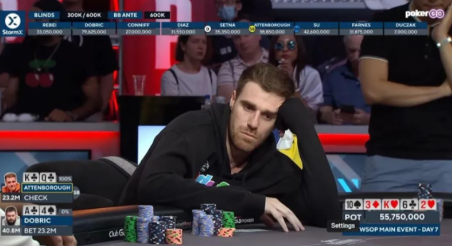 Dobric不得不亮出他的A high,Attenborough赢得了这个7890万的巨型彩池,一跃成为筹码领先者。