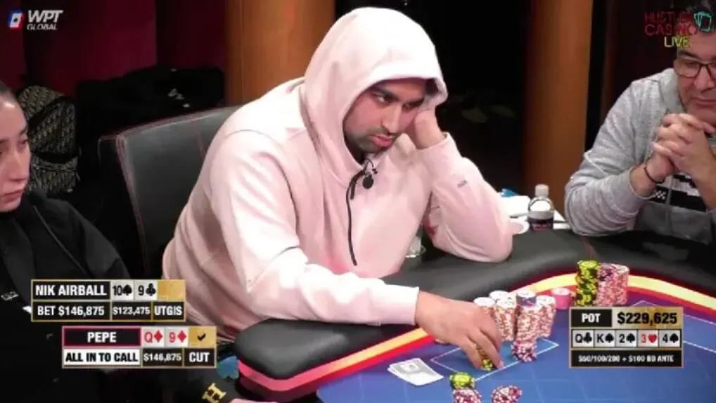但问题是,两位非常激进的玩家(Yoh Viral和Nik Airball)处于第三盲注和straddle位置,这相当于在邀请他们来挤压自己。最终Pepe不得不用Q♦9♦跟注Airball的加注,而不是自己加注。