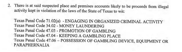 近日,PokerNews获取到了相关的搜查与扣押令。在这份长达22页的文件中,披露了TABC自2024年6月对The Lodge俱乐部展开卧底调查的全过程。调查人员认为该俱乐部存在大量涉嫌违规的财务交易,指控The Lodge共涉及五项违反德克萨斯州法律的行为:从事有组织的犯罪活动;洗钱;推广赌博;经营赌博场所;持有赌博设备、器材或用品。