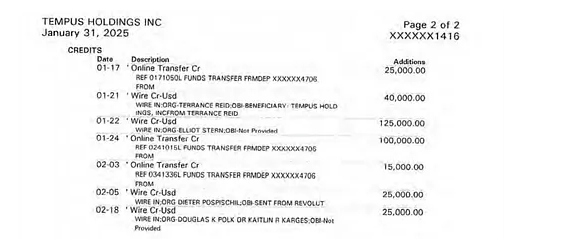 在2025年1月1日至2月28日期间,约有80.8万美元从Tempus Holdings的公司账户转入到了一个“自动转账”业务账户,该账户用于将资金自动移入高收益账户。而作为主要股东的Polk、Jake Abdalla和Jason Levin,是该账户的签字人。