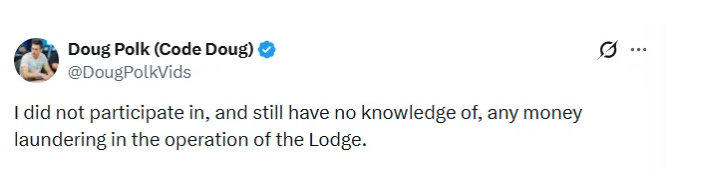 Doug Polk在周一发表声明称:“我没有参与、至今也对The Lodge运营中的任何洗钱行为毫不知情。”