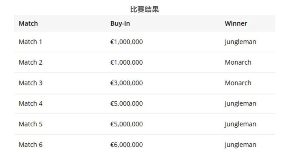在首场每人100万欧元的对局中,Jungleman拔得头筹,但随后在第二场相同规模的比赛里输给了对手。