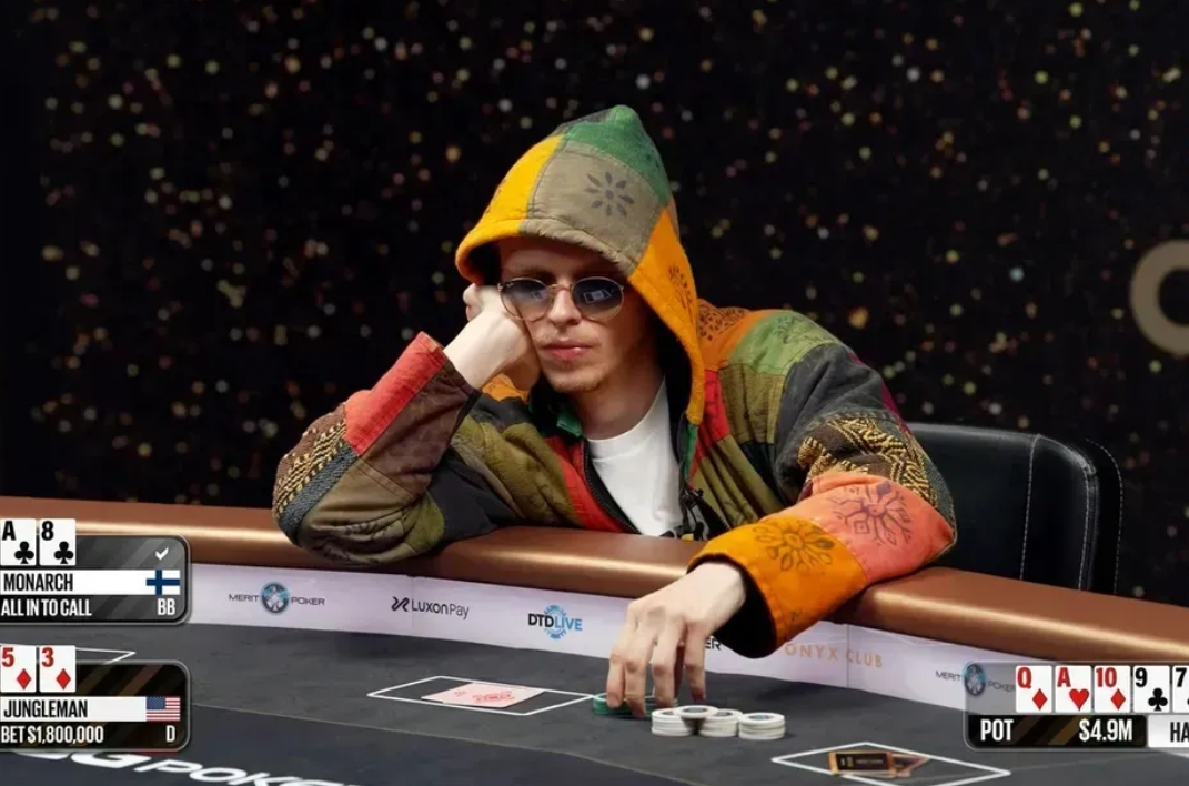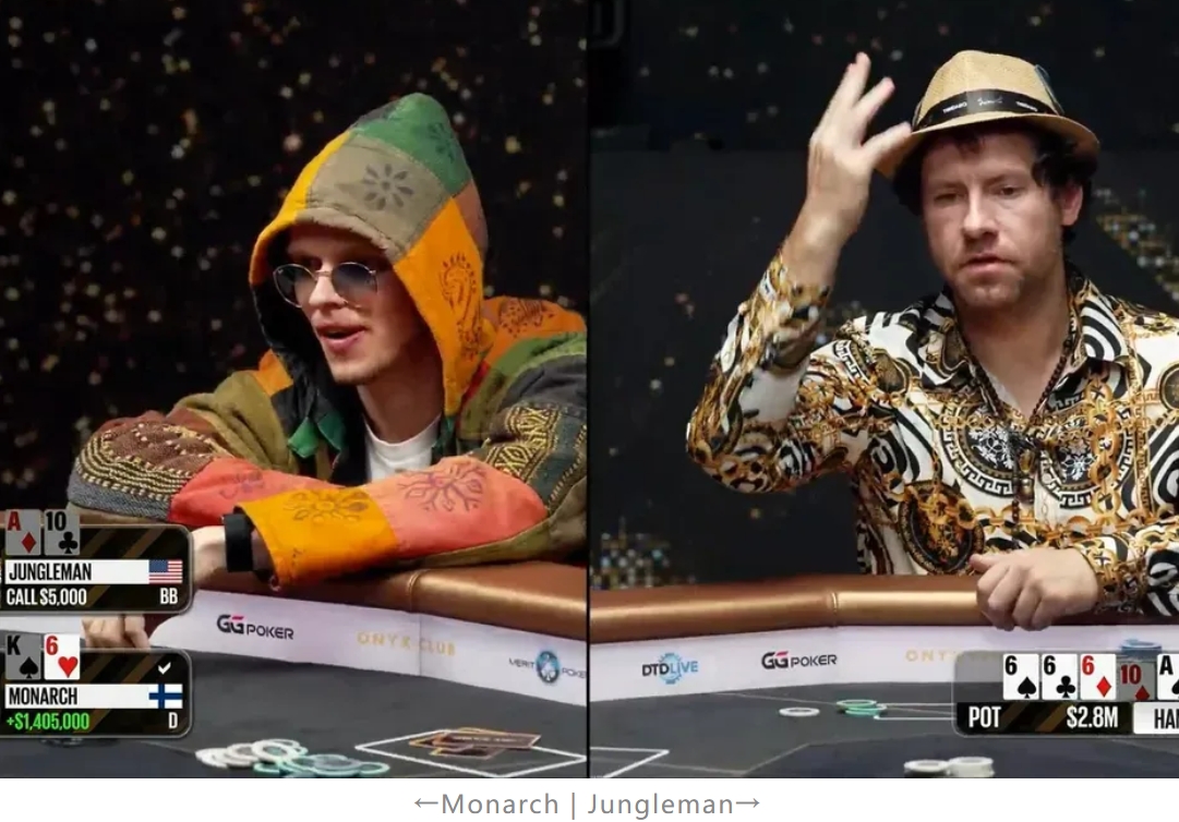 尽管如此,Monarch依旧不愿放弃,再次挑战Jungleman,这一次的对局规模更高——每人600万欧元,盲注提升至 $30,000/$60,000。