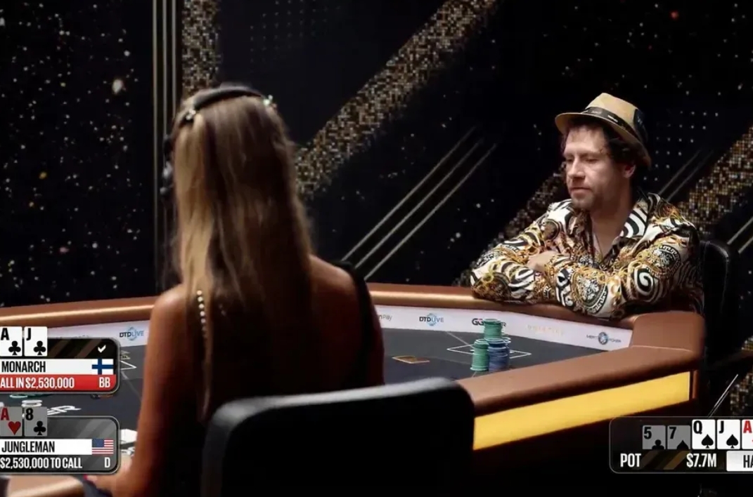 河牌:A♦。底池已经达到了520万,Monarch全压了他最后的253万筹码,使得底池达到了惊人的770万美元。如果Jungleman跟注,这将会成为世界上第一个电视直播的八位数底池,但经过深思后,Jungleman做出了正确的弃牌。