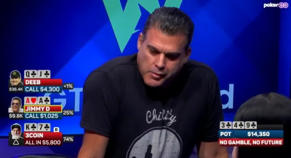 结果Deeb突然过牌-加注到$1,500。Jimmy D跟注后,筹码量最少的3Coin直接推了$5,800全下!
