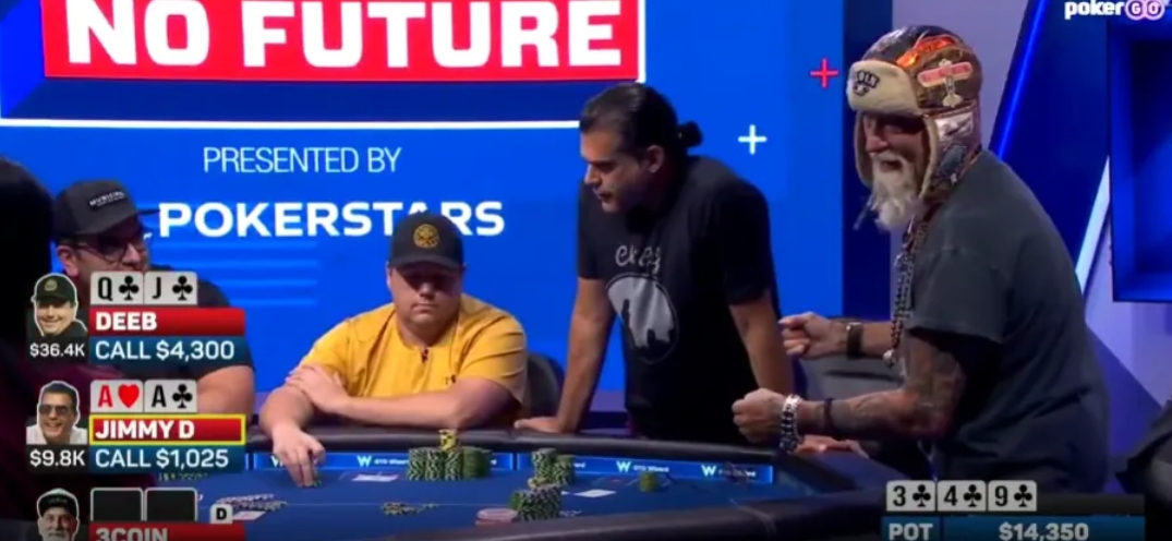Jimmy D在全下之后,与Deeb形成一个$10,900的边池,同时争夺$18,650的主池,而他只有5个补牌能够赢下底池。