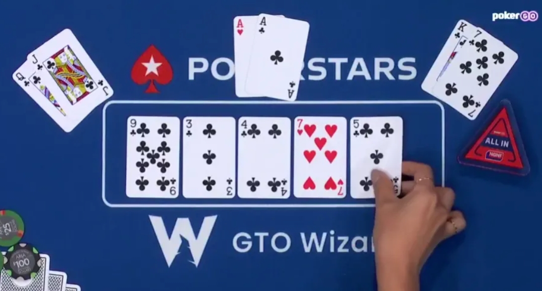 翻前,Deeb拿着Q♣J♣平跟入池。后面位置的Jimmy D’Ambrosio手持A♥A♣加注到 $375。按钮位的 Randy “3Coin” Sadler用K♣7♣跟注。Deeb也跟注,三人看翻牌。