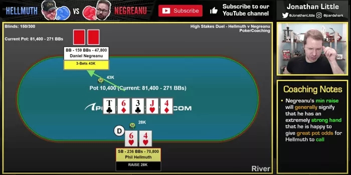 然而,丹牛已经明确表示,因为他认为Hellmuth偏紧,他不会在Hellmuth决定投入大筹码到底池时做较松的跟注。如果Hellmuth认为丹牛不会用高对或强顶对支付,那么他应该只是跟注。