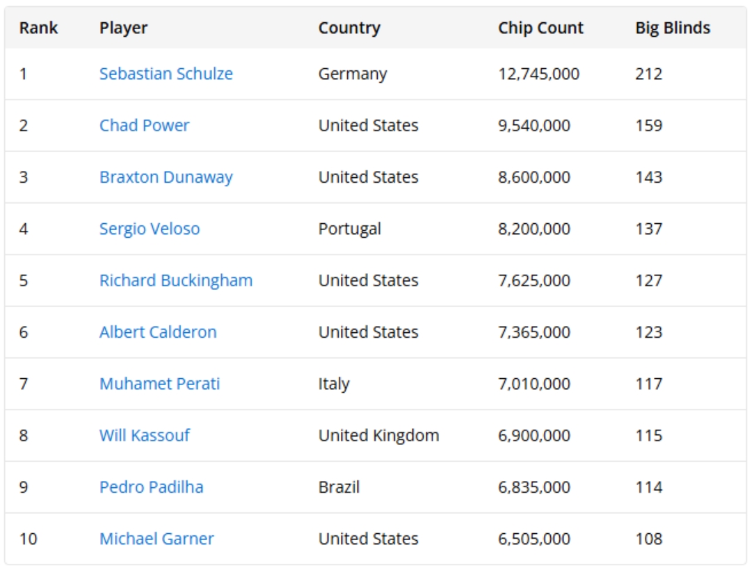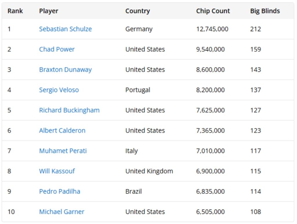 以下是晋级Day6的202位选手中,筹码量排名前10的: