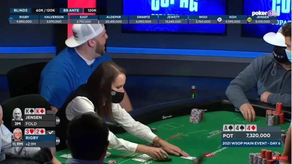 但是,Rigby在上这个主桌之前,有过一些打得很疯狂的“前科”,而且这个时候的Jensen已经把筹码的42%投入到底池里了,你可以说他已经不太能离开底池了,所以这个时候跟注也是没有问题的。