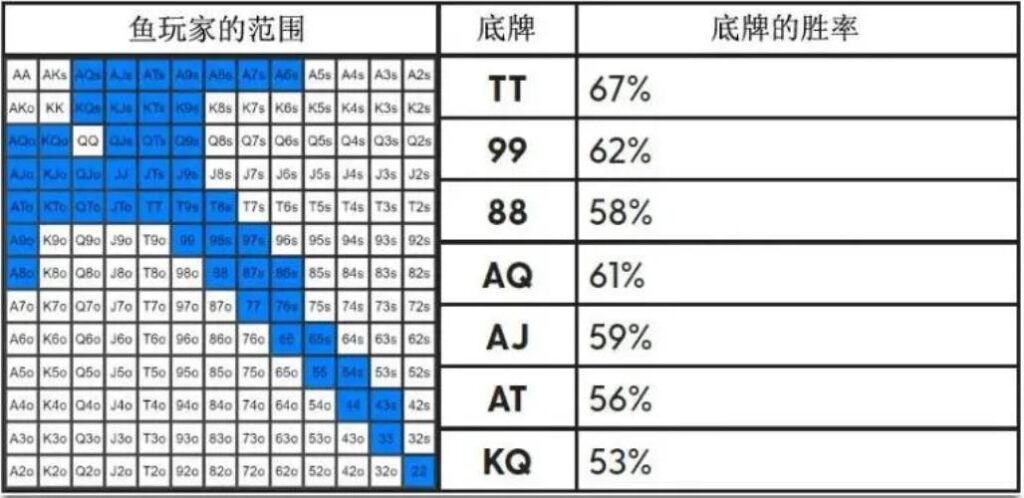 如果鱼玩家将用20%的起手牌范围(JJ-22,AQs-A6s,K9s+,Q9s+,J9s+,T8s+,97s+,86s+,76s,65s,54s,43s,AQo-A8o,KTo+,QTo+,JTo [o指不同花,s代表同花] )回应你的3bet,这些牌将具有以下胜率: