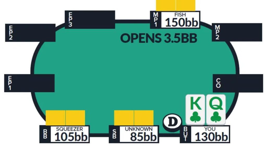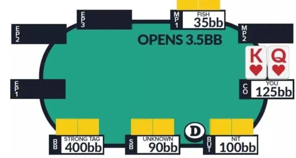 有效筹码量35BB。鱼玩家在中间位置率先加注到3.5BB,你在CO位置拿着KQ。3bet将使你陷入底池——即使你只3bet到11BB,如果鱼玩家翻前全压,你也会得到不错的跟注价格。