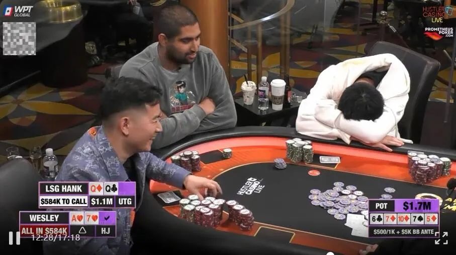 Hank过牌,Wesley秒all in后趴在了桌上。