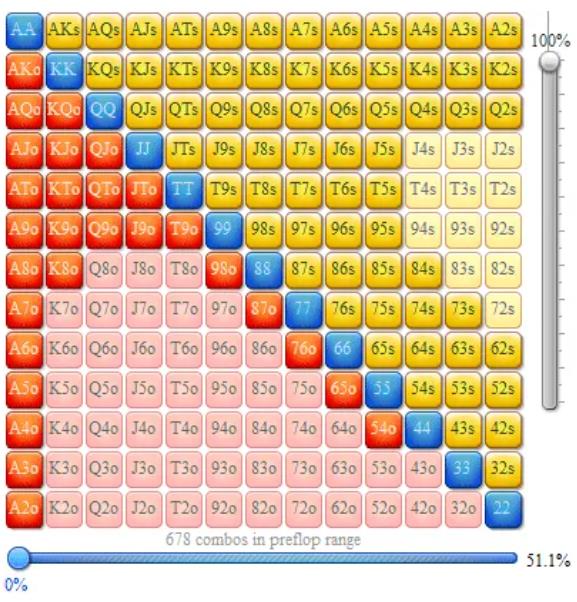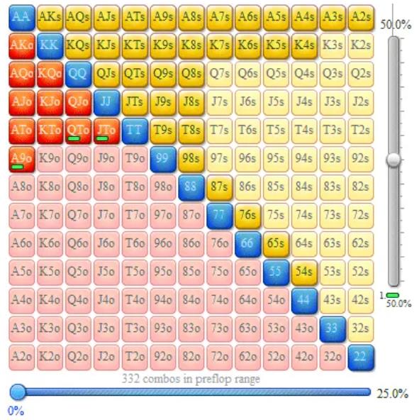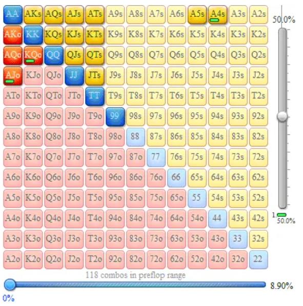 由于他们玩的游戏既有前注还有straddle,Polk应该用大约前25%的手牌进行率先加注。这比没有前注和straddle的牌局范围稍宽。
