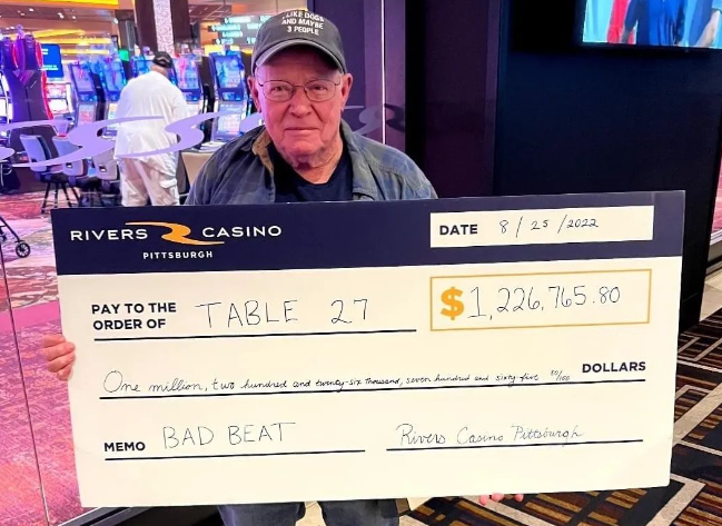 另外,同年的8月,在美国匹兹堡的一家扑克室,一位叫Benjamin Flanagan的老爷爷,在盲注级别$1/$3的低级别游戏中,翻牌击中四条A,然后被皇家同花顺河杀,同样幸运的开启了$1,226,000的“爆冷大奖”,他最终分走了40%的奖池,将近50万刀。而那也是美国现场扑克历史上最大的爆冷大奖。