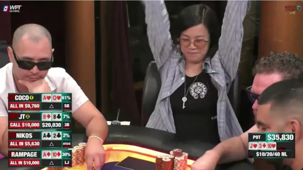 Rampage击中对子10暂时领先。而Coco拿到皇家同花顺听牌,开心的高举双手。