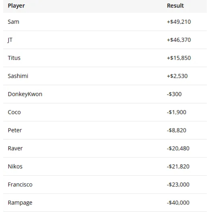 当晚,Rampage的比赛以亏损$40,000垫底告终,而JT凭借对Rampage的“河杀”吃下巨池,最终盈利$46,370,排名第二。