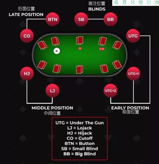 在德州扑克中,按钮位置(BTN)是最好的位置。当你坐在按钮位置时,你是后续三个回合(翻牌圈,转牌圈和河牌圈)最后行动的人。