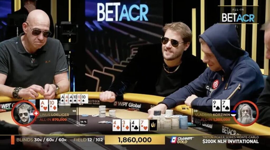 在这手牌中,Korzinin用97s公开全压,被Loeliger跟注,并将他淘汰出局