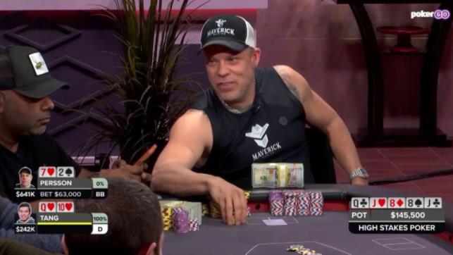 Stanley Tang陷入沉思,Eric Persson开始和他交谈,试图说服他弃牌,结果真的成功了,Tang弃牌了,而Persson则用一个7-2诈唬赢得了145500美元的好彩头!