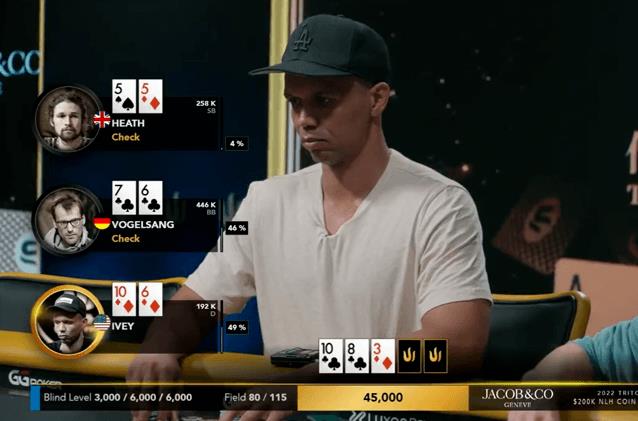 Ivey击中了顶对,Vogelsang拿到顺子同花听牌。Heath的牌在翻牌圈没有得到提升,几乎是死听。当过牌至Ivey时,他打了16,000,Health和Vogelsang都跟注。