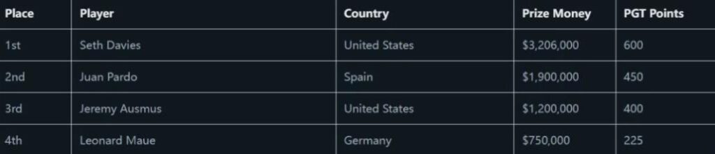 而夺冠的Davies收获了自己职业生涯中的最高奖金:3,206,000美元,他的职业生涯锦标赛总收入已超过29,268,000美元,历史奖金榜上排名第26位。