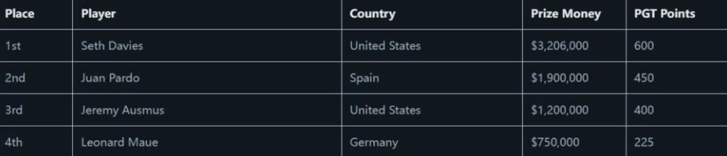 而夺冠的Davies收获了自己职业生涯中的最高奖金:3,206,000美元,他的职业生涯锦标赛总收入已超过29,268,000美元,历史奖金榜上排名第26位。