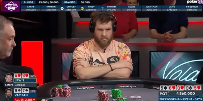 Rigby领先下注325,000,Brown弃牌,击中一对10,同时拥有同花听牌的Lewis跟注,而拿到顺子听牌的Vampan决定加注到750,000。Rigby弃牌,Lewis思考片刻后跟注。