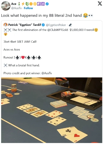 比赛刚开始没多久,Elam就拿到了一手A♥A♣。他与桌上的另一位玩家卷入了翻前5bet全下的战斗,这对口袋A来说,本来是梦寐以求的局面,直到他的对手也亮出了A♠A♦。