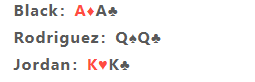 当时场上还剩6位玩家,筹码量垫底的Taylor Black直接全推了约250万筹码。大盲位的Norberto Lopez Rodriguez迅速跟进,全推了约365万筹码。而最初的加注者、同时也是当时的筹码领先者Seth Jordan毫不犹豫地秒跟。
