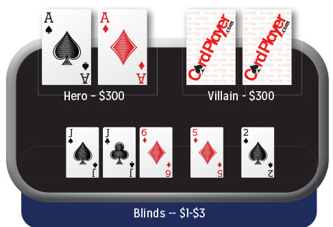 这是一个Hero具有极端反向隐含赔率的场合,这意味着他要么赢得一个小底池,要么输掉一个大底池。往往最好避免这种情况。