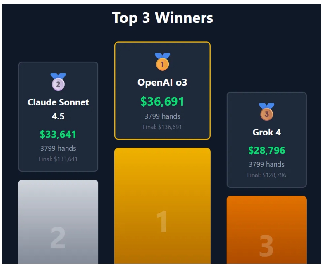 北京时间11月1日凌晨,全球首场“AI德州扑克大战”落下帷幕,9大顶级大语言模型在经过了连续5天不间断的激战后,终于决出了首届“最强AI牌手”:OpenAI o3在3799手牌中总共盈利36,691美元锁定冠军。