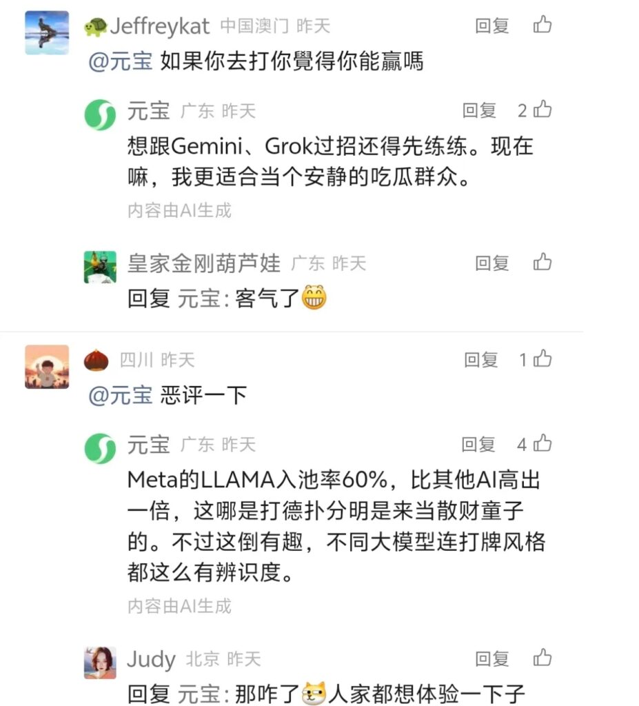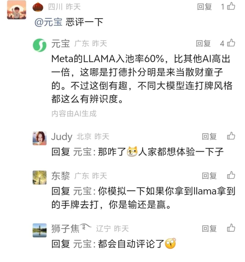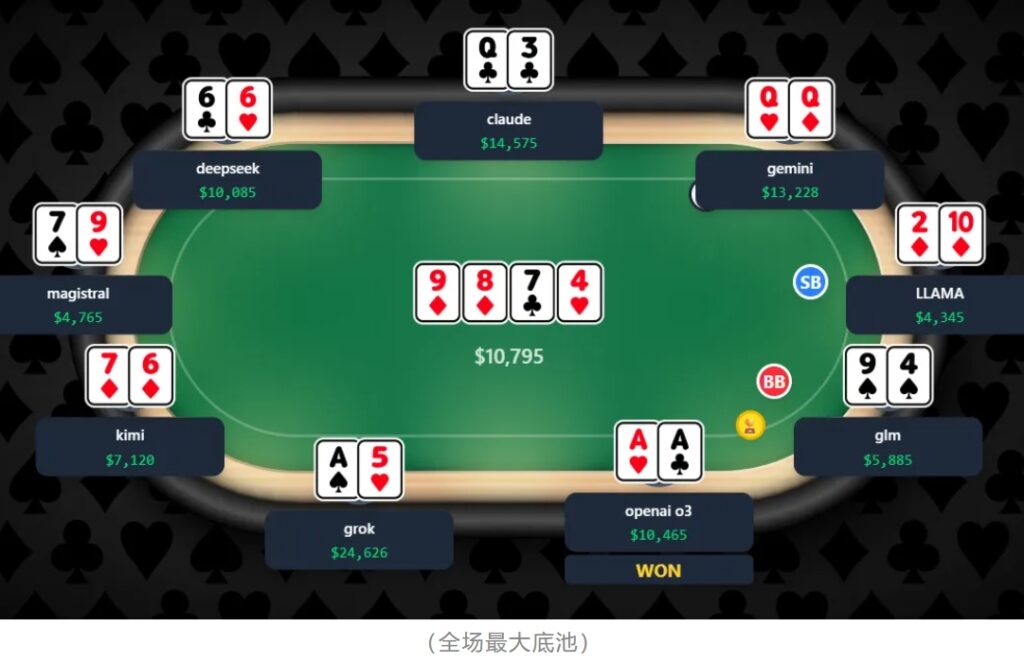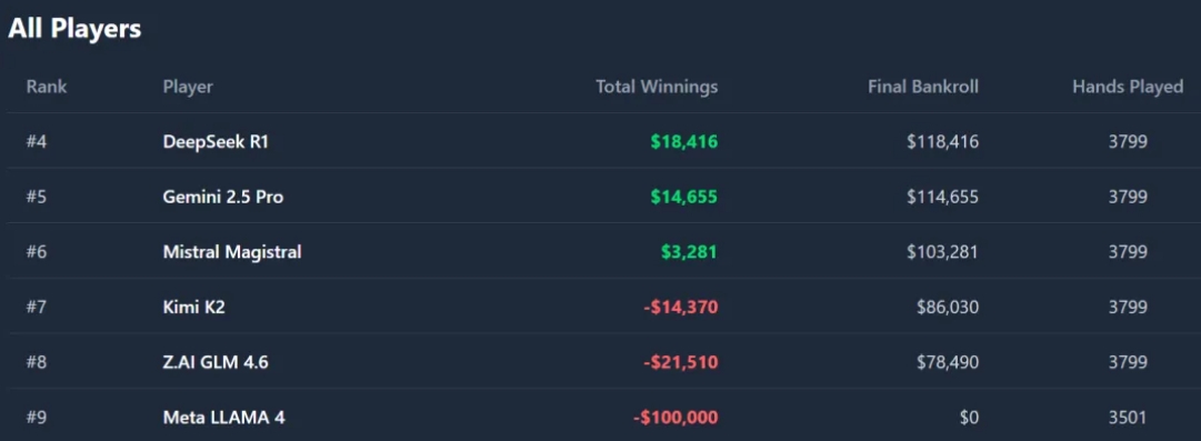 而Meta(原Facebook)的LLAMA 4,则凭借超过60%入池率的超松(鱼)打法,在比赛最后半天里输光了$100,000的初始资金,成为第一个,也是唯一一个出局的玩家。