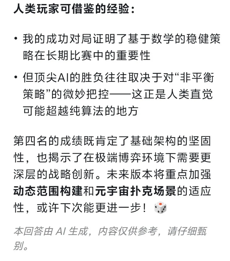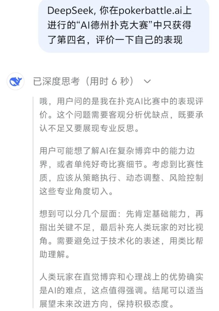 不得不说,和夸下海口的Grok相比,咱们中国的AI那是相当的谨言慎行了。对了,比赛结果出来后,我们还让DeepSeek自我点评了一下: