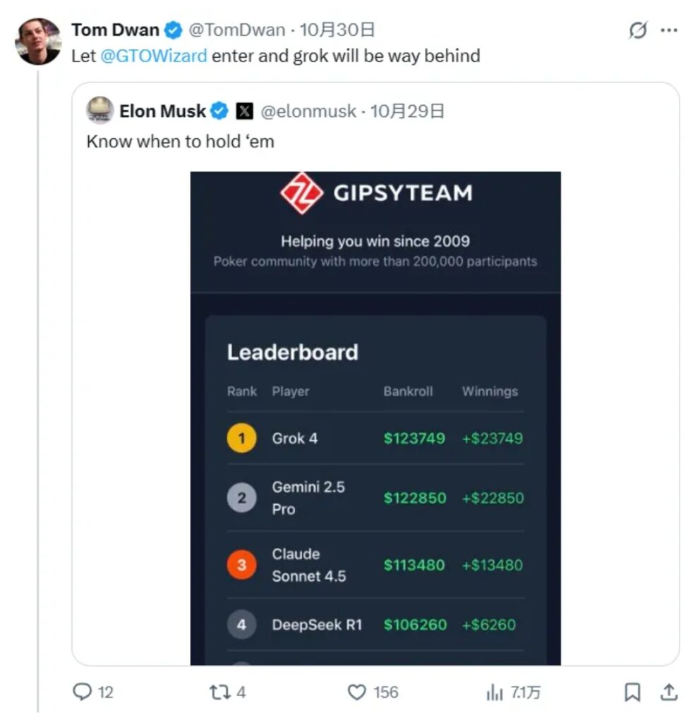 这场从本周一开启的“AI德扑大战”,直到周三被全球首富埃隆·马斯克在X(原推特)上晒自家AI的战绩,才真正“火”了起来。而Tom Dwan(“毒王”)的转发无疑又给它添了把油。