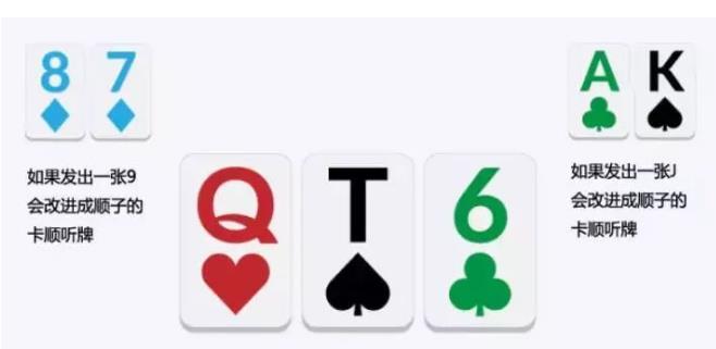 不过卡顺和卡顺也是不一样的,比如AK在Q-T-6翻牌面,除了一个卡顺听牌还有两张高牌。还有的时候,一手起手牌可能拿到两种卡顺听牌(即双重卡顺听牌),例如89在Q-T-6翻牌面就是双重卡顺听牌,一张J或一张7都将使它成为顺子。