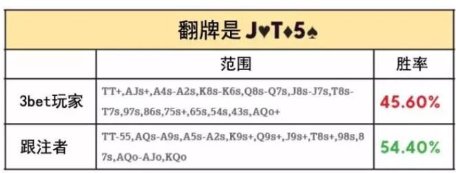 可以看到,3bet玩家在J-T-x翻牌面处于大下风。这就是问题所在:AK拿到卡顺听牌的翻牌面通常也是对跟注者最有利的翻牌面。