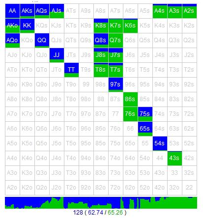 可以看到,软件建议AKo(o代表off suit,指不同花色)和AQo既可以过牌也可以下注,也就是采用混合策略。