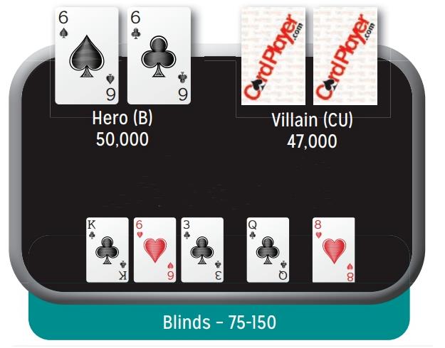 面对一个极小的河牌圈下注,你除了跟注别无选择。虽然你很多时候在对抗一副同花,但对手仍可能用两对或一对做这种下注。