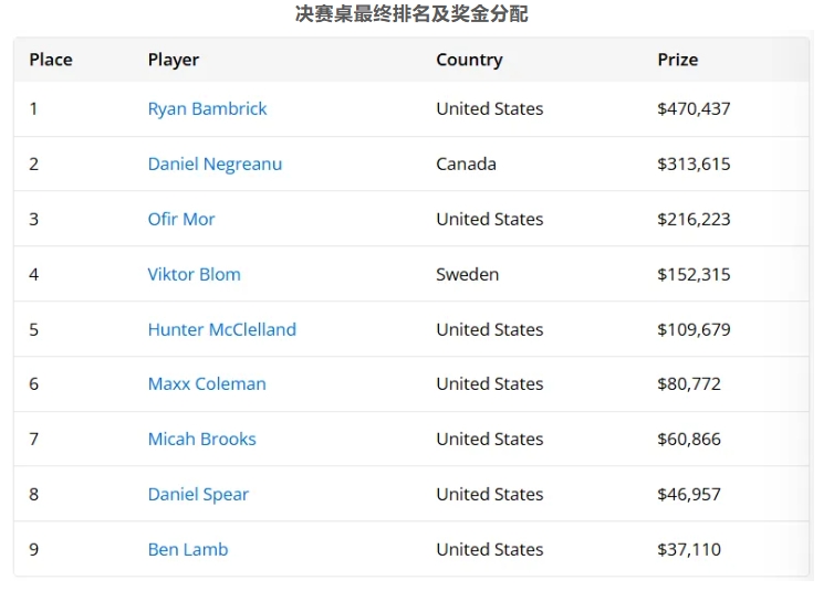 而另一位夺冠大热门、瑞典扑克传奇人物Viktor Blom也再次与自己的首条金手链擦肩而过。最终,来自美国的Ryan Bambrick扮演了“搅局者”角色,收获了他个人第二条WSOP金手链和$470,437的冠军奖金。