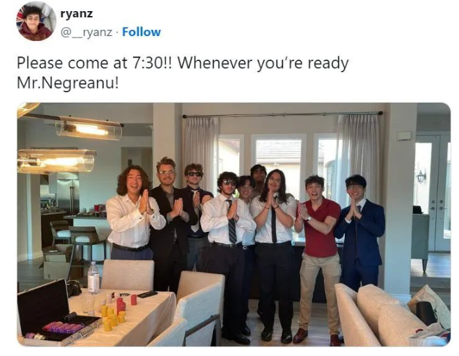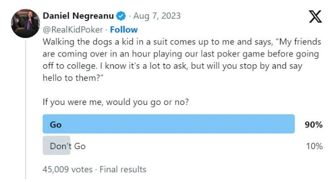一周前,当丹牛正在家附近遛狗时,邻居一个穿着西装的小伙子走上前对他说:“一个小时后,我的朋友们要过来一起打扑克,这是我们上大学前的最后一场Home Game。我知道你现在可能满头问号,但是能请你过来和我的朋友们打个招呼吗?”丹牛立刻把这事儿发上了推特,还做了个投票问粉丝的意见: