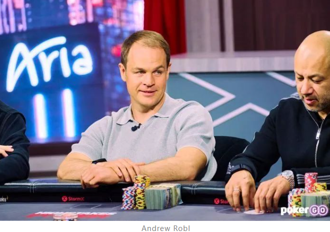 节目刚一开始,戏剧性就拉满。第一手牌,盲注:$1,000/$2,000,带$4,000的Straddle。Andrew Robl拿着4♦4♥率先加注到$15,000,Straddle位置的JRB用Q♣8♣跟注。