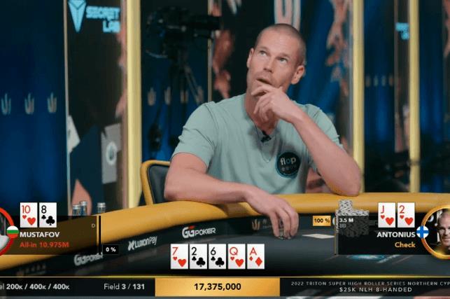 这手牌发生比赛只剩下三名选手的时候。盲注是200000/400000/400000。Mustafov在按钮位置用T♥8♣(T代表10)加注到800000。Antonius在大盲位置用J♥2♥跟注。