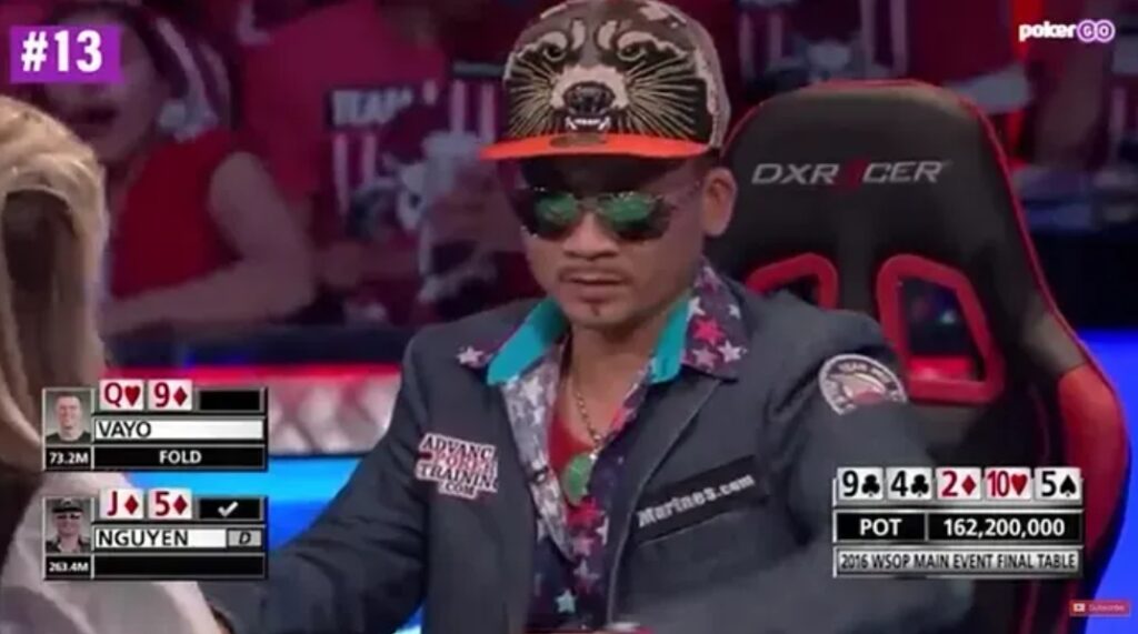 如果Vayo跟注,他将获得约2.5:1的筹码领先;但他选择弃牌,筹码量瞬间掉到1:4,最终屈居亚军。而Nguyen凭借这次扑克史上最顶级的诈唬之一,最终赢得冠军和8,005,310美元的奖金。