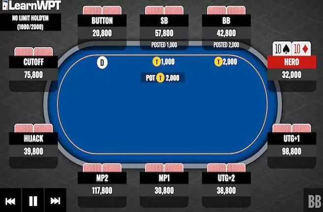 在一个盲注级别为1000/2000的无限注德州扑克锦标赛中,你在枪口位拿到了T♠T♦,你的筹码量只剩下16BB,其余玩家筹码量如图: