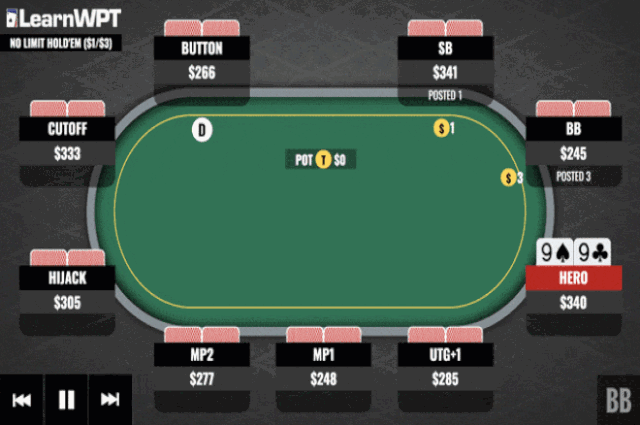 翻前,你在UTG位置(under the gun,枪口位,大盲位左边的位置)拿着9♠9♣率先加注到$15,你后面的UTG+1玩家(形象未知)3bet到$50,后面玩家都弃牌,现在轮到你行动。