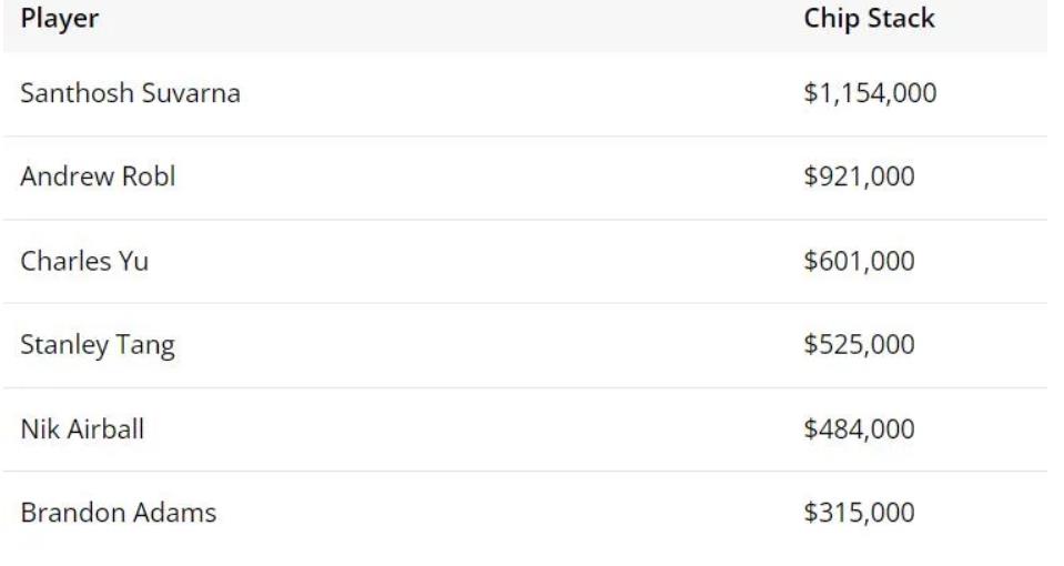 与这两位扑克玩家一起坐在牌桌上的还有Charles Yu、Stanley Tang、Nik Airball和Brandon Adams。节目开始时,各位玩家的筹码量如下: