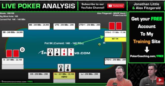 回顾这手牌,我觉得对手错失了在河牌圈全下诈唬的机会。Fitzgerald的范围中包含很多破产听牌,如果对手在这里全下,他很难用一对跟注。