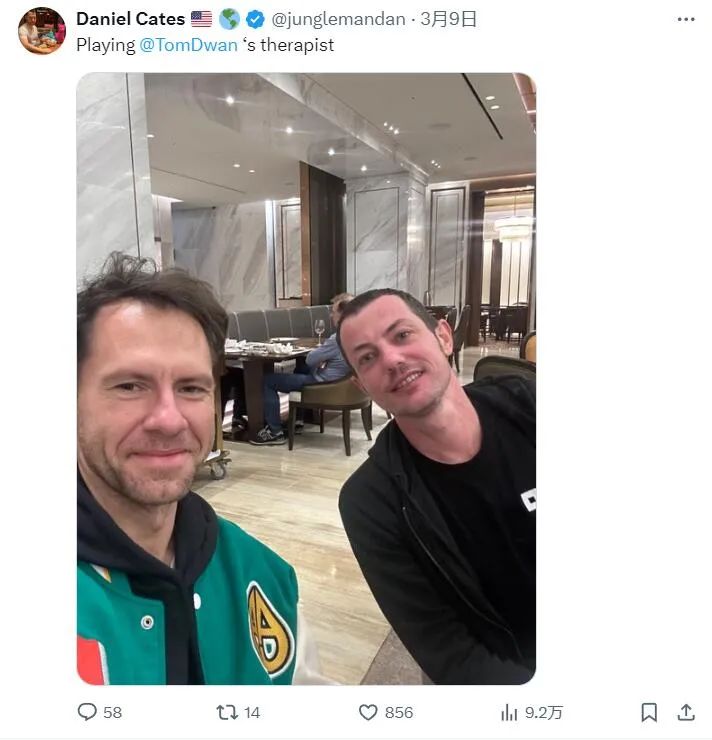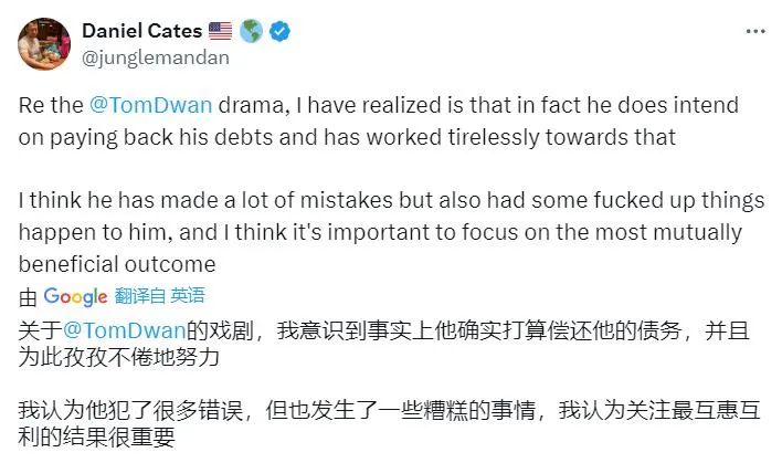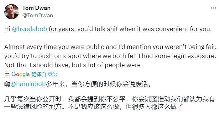 或许是因为“大使”的工作让Dwan无法再继续神隐,自2023年9月15日后就再也没有更新过推特(现在叫“X”)的Dwan,于3月9日重新现身,并且主动@债主Haralabos Voulgaris,一连发了好几条推文。
