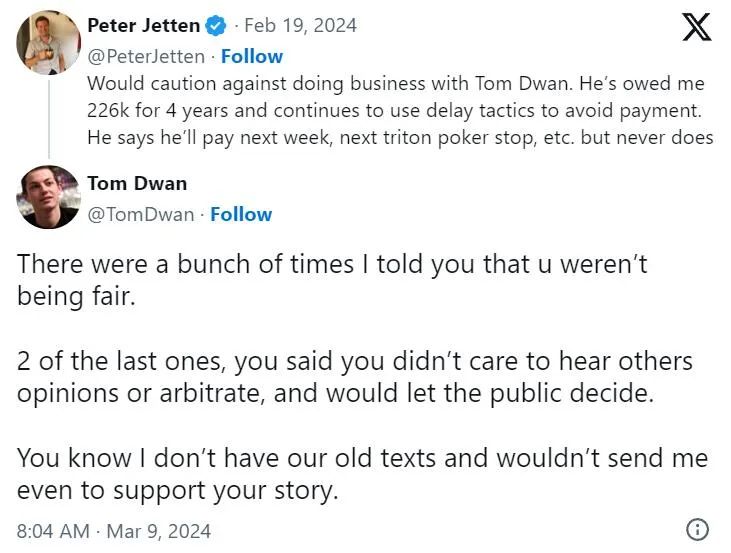 至于另一位债主Peter Jetten的指控,Dwan也在相应的推特后留了言:
